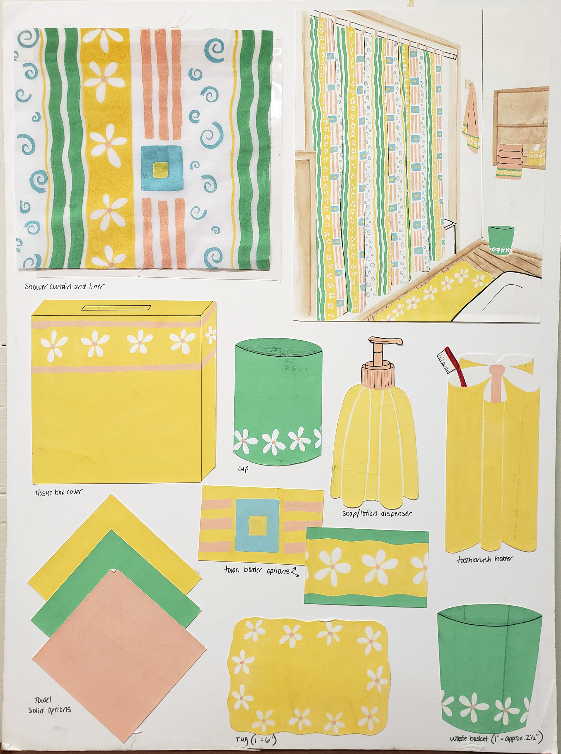 Below is a complete bathroom design and a complete restaurant design. Both were created in 1998/1999 using gouache.