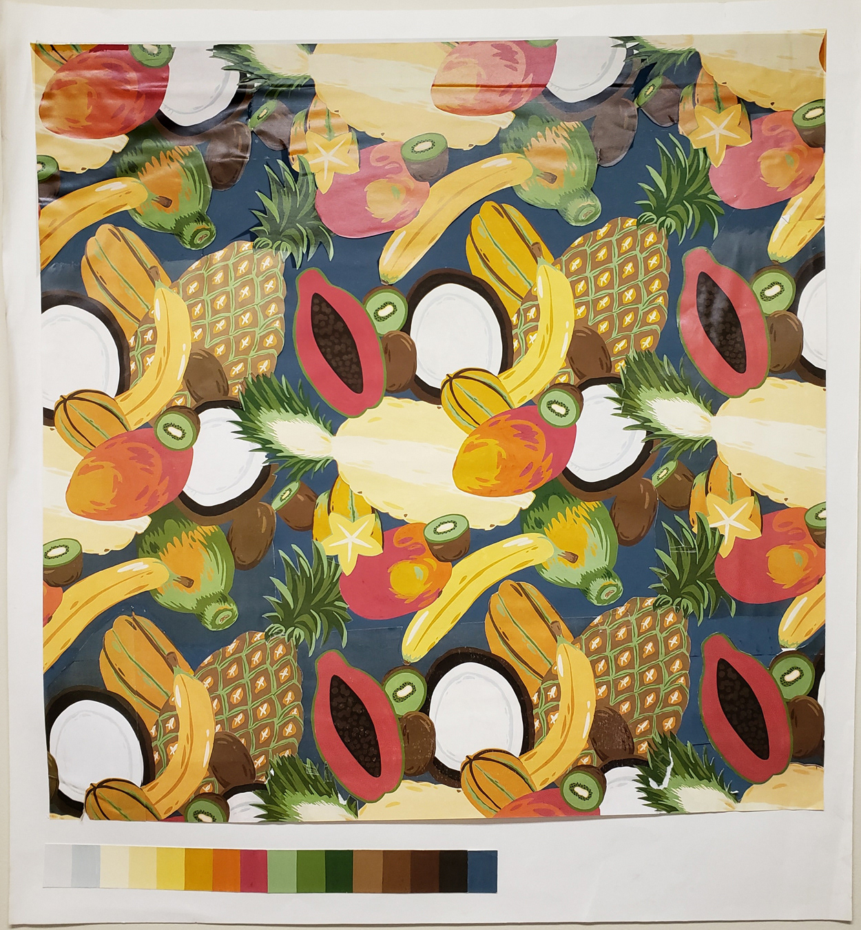 The above images are divided diagonally. In the left image, the bottom right is a real piece of fabric. In the top left triangle, Deborah mixed paint colors to draw and complete the pattern by hand. In the image on the right, the top left triangle is the original fabric, and Deborah created a new colorway to complete the pattern on the bottom right.